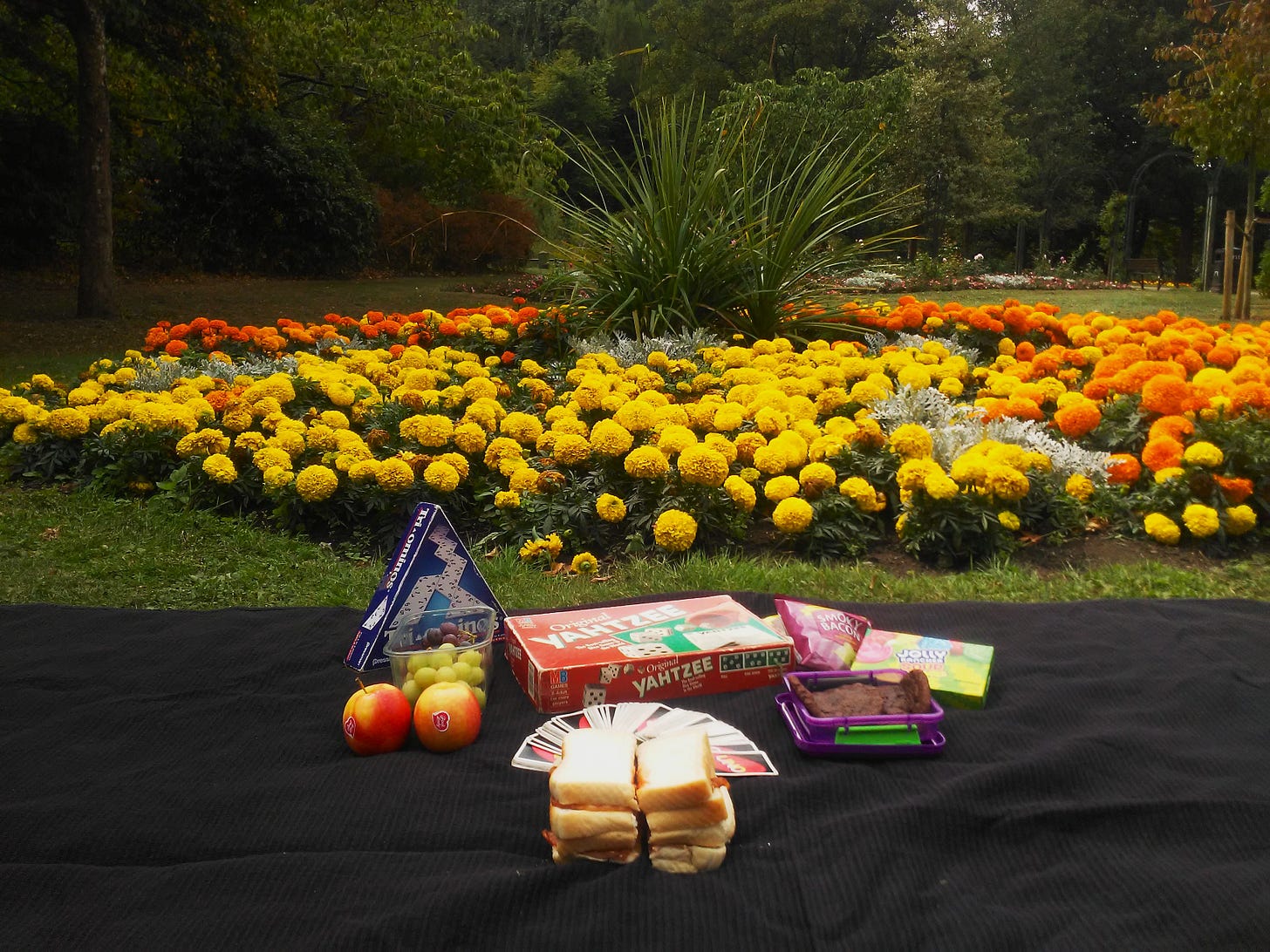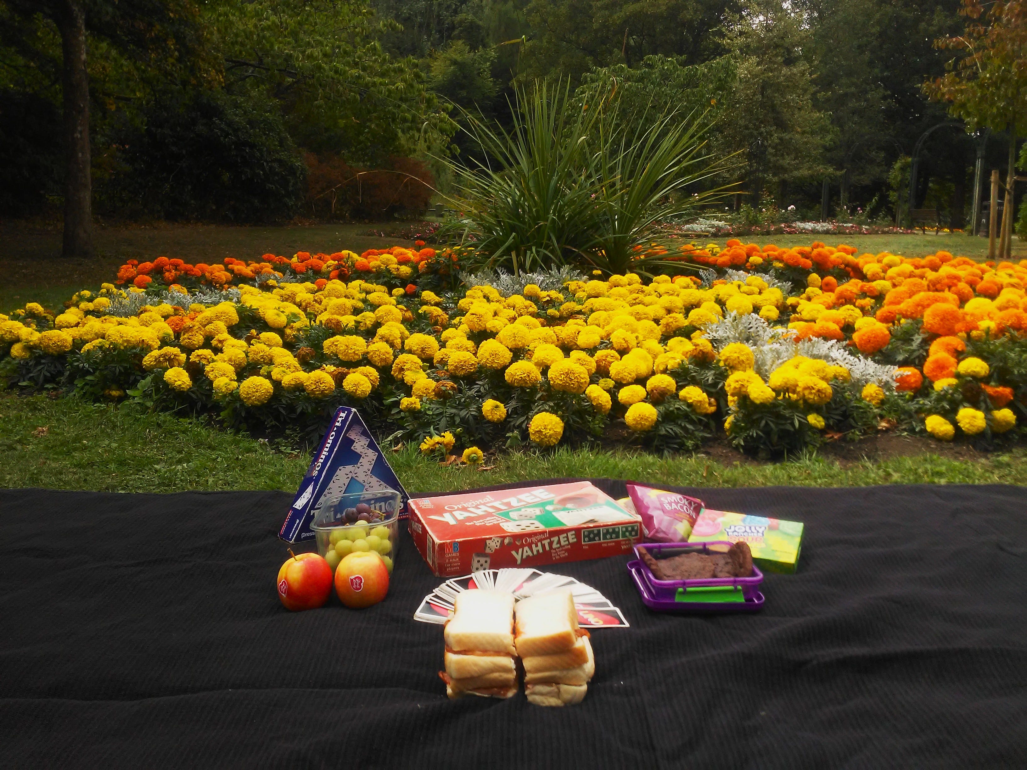Although home cooked bacon sandwiches together with some fruit, sweets and homemade chocolate brownies were on the picnic agenda, game playing defeats lay ahead for me and from a highly motivated son who shyly giggled when I said he’d be desperate to beat me at “Uno” as today, two game wins would see him reach the thunderous lifetime game wins total of 500. The smiling assassin in The Shining t-shirt opposite me went one better by winning all three of our games as despite me scoring 94, 96 and 70 points in our races to 100 points per game, he plucked cards from the ether like David Blaine and couldn’t hide his giggling delight. As is tradition, Yahtzee was up next (we’d moved on from bacon sandwiches, grapes and apples by this point to the delicious homemade chocolate brownies) and another defeat for your humble narrator as I failed to throw a “Four of a Kind” with the last throw of my five dice, collapsing to defeat by just 11 points, 255–244. And if that wasn’t enough of a game playing humiliation, we played the quickest game of Tri-Ominos ever (think dominos, but with triangular shaped tiles) as I crumbled to another defeat by 167 points to 121.